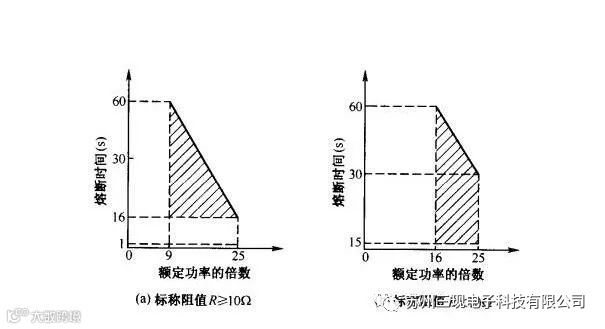横坐标是电阻器额定功率的倍数,纵坐标是熔断时间(S)。熔断特性曲线表明,当熔断器电阻器承受的实际功率为数倍时,电阻器的连续负荷会因过热而开始熔断。a表示标称为阴值R≥10oΩ,b表示R<Ω。