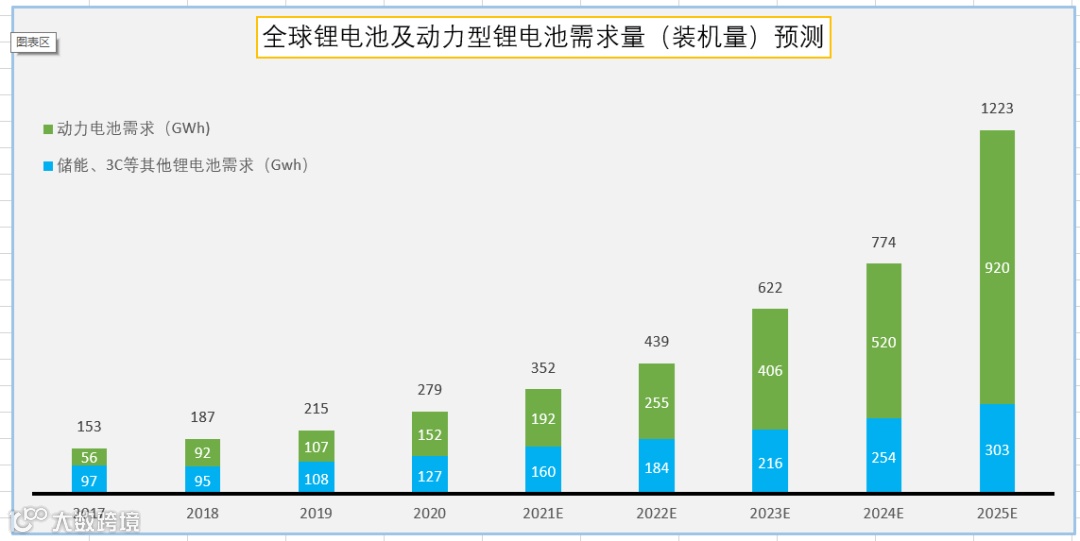 《报告》指出,得益于全球节能减排趋势及新能源汽车产业的快速发展,全球锂电池市场需求增长迅猛,预测在2025年达到1223亿瓦时。2020年,中国市场对动力电池的需求位居世界首位。随着中国新能源汽车的消费驱动及整体生态环境的提升,即使补贴退坡,中国动力电池终端需求仍持续乐观,预计未来五年会以40%的CAGR(年复合增长率)增长。