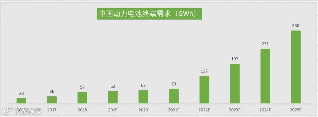 《报告》预测,2021年,中国动力电池终端需求将上升至73亿瓦时,到2025年,将达到360亿瓦时,CAGR增长将达到40%。
