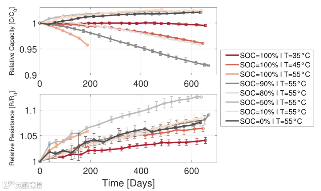 图3. 循环老化测量数据。平均值与标准偏差标绘并归一化到初始值。
