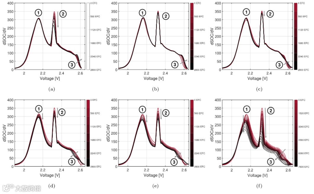 图5. 在不同的DOD和T=45℃的3C循环老化测量中,IC曲线的变化。(a) DOD=5% (SOC=95 - 100%) 的IC曲线。(b) DOD=5%(SOC=0 - 5%)的IC曲线。(c) DOD=40%(SOC=10 - 50%)的IC曲线。(d) DOD=80%(SOC=10 - 90%)的IC曲线。(e) DOD=90% (SOC=5 - 95%) 的IC曲线。(f) 7200次EFC后DOD=90%(SOC=5-95%)的IC曲线。