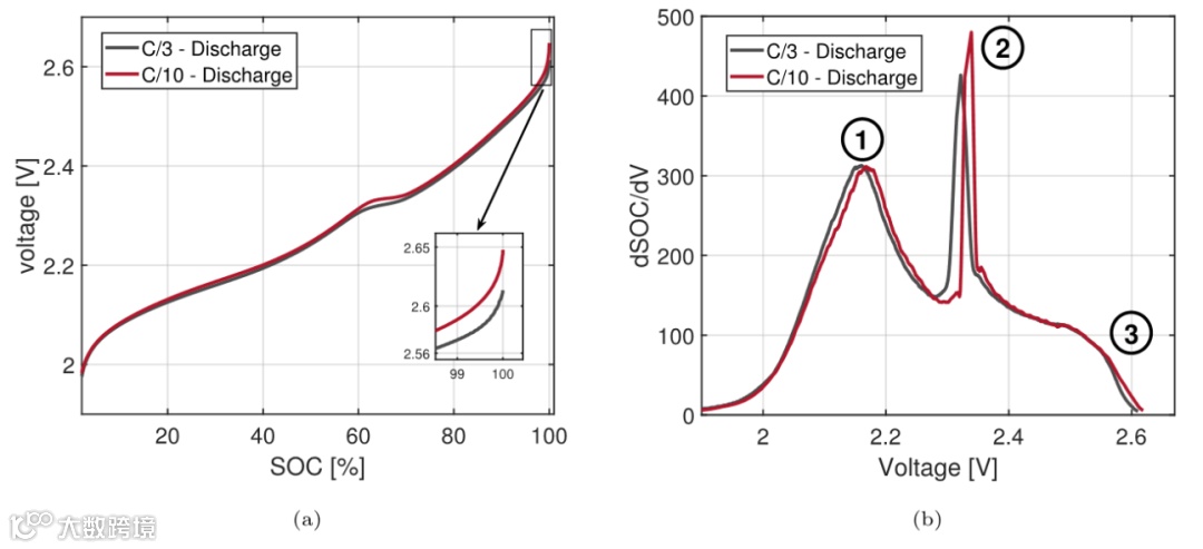 为了得出关于起始电池特性的结论,作者采用了容量增量分析(ICA)方法,该方法可以在不需要拆卸电池的情况研究长期老化效应。试件初始测得的C/10和C/3放电曲线见图1a。通过对这些流量曲线的比较可以看出,初始时两条曲线之间仅存在边际偏差。对锂离子电池的研究表明,锂离子电池的半电池电位处于两相转化区。在该区域内,负极电位有一个平台,几乎恒定在1.55 V。由于开路电压(OCV)是正极和负极半电池电压叠加的结果,在锂化过程中,电压曲线在达到充电截止电压(EOCV)前不久的急剧倾斜表明负极限制了可获取容量的值。本文分析了在起始寿命(BOL)下C/10和C/3放电的初始dSOC/dV曲线的计算结果,并比较不同C率下的IC曲线,可以发现在C/3时,与C/10的放电峰相比,其相位平衡峰略有水平偏移。IC峰的强度下降,表明在2.3-2.4V的电压范围内,可获取容量下降。由于LTO在两相转化区的恒定电压,负极表现为一个参考电位。因此可以得出结论,IC曲线中的峰值可以完全归属于正极,而每个峰值都代表正极的相位平衡。