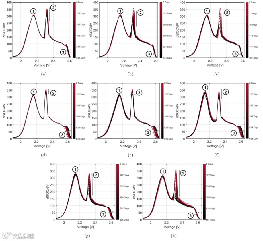 图4. 在35℃、45℃和55℃三个不同的环境温度下,在恒定的存储SOC=100%时,存储老化测量的IC曲线的变化。(a) 在T=35℃和SOC=100%的IC曲线。(b) T=45℃和SOC=100%时的IC曲线。(c) 在T=55℃和SOC=100%时的IC曲线。在恒定温度T=55℃下,五个不同存储SOC下的存储老化测量的IC曲线的变化。(d)T=55℃和SOC=0%时的IC曲线。(e)在T=55℃和SOC=10%时的IC曲线。(f)在T=55℃和SOC=50%时的IC曲线。(g) T=55℃和SOC=80%时的IC曲线。(h)在T=55℃和SOC=90%时的IC曲线。