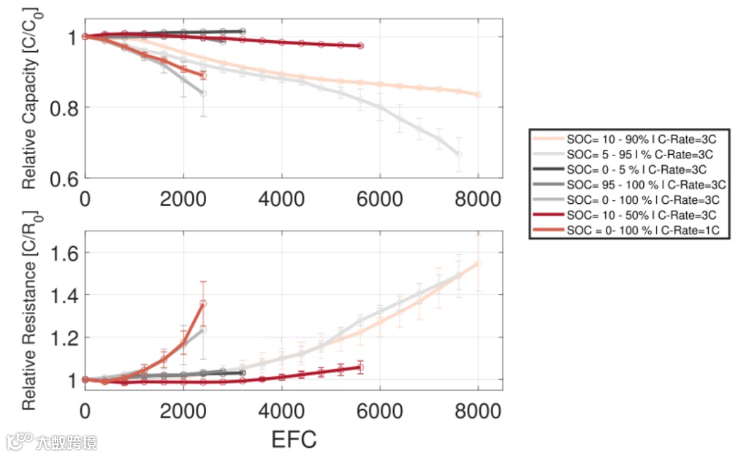 本文给出了在等效完整周期(EFC)量上绘制的循环测量结果(图3)。同样,对具有相同测试点的电池的标准差和平均值进行了描述,并将平均值用于进一步的研究。容量归一化为C/3放电时初始测量的可获取容量,而内阻值归一化为50% SOC时初始10s后4C脉冲电阻。与存储老化结果相比,一些测试的循环老化测量结果表明,在相同条件下运行的电池之间的容量偏差更大。在达到一定的降解水平后,这一点变得明显,特别是在高放电深度(DOD>90%)。在3C时DOD = 100%进行的测量,在进行1200 EFC后,容量的标准偏差为1.07%,在进行2400 EFC后增加到6.53%。这一偏差远高于已确定的2.3%电池间变化。原因一方面可以归因于测量的设置;另一方面,在电池老化过程中,故障的性质导致一定程度的非可预测的强衰减机制。关于测量的设置,三个串联的测试单元中最弱的单元限制了整个串联的吞吐量。这种影响继续延伸,在某些时候,最弱电池的容量衰减与其他连接的电池相比要高得多,这导致无法达到预期的放电深度。这种自我强化的误差随着最弱电池的老化水平提高而增加,当剩余的可用容量达到大约85%以下时,这种误差就变得非常明显了。在DOD=100%的情况下,在3C条件下循环的电池的老化程度最高。在2400次EFCs之后,容量下降了16.07%,内阻增加了23.5%。DOD和降解水平之间有一个明确的关系是可以确定的。对于高放电深度,与在低放电深度下进行的测量相比,容量下降和内阻增加的速度快了几倍。总的来说,LTO电池展现出很高的循环稳定性,尤其是在DOD低于50%的情况下进行循环。可以看出,循环老化在高放电深度下很明显,这与对其他类型的LIBs进行的各种研究结果一致。在容量衰减和电阻增加方面,DOD为100%时,老化的进展最为迅速。此外,电池在以较高的倍率循环时经历了更快的容量损失,而内部电阻增加显示了相反的行为,并随着倍率的降低而增加。