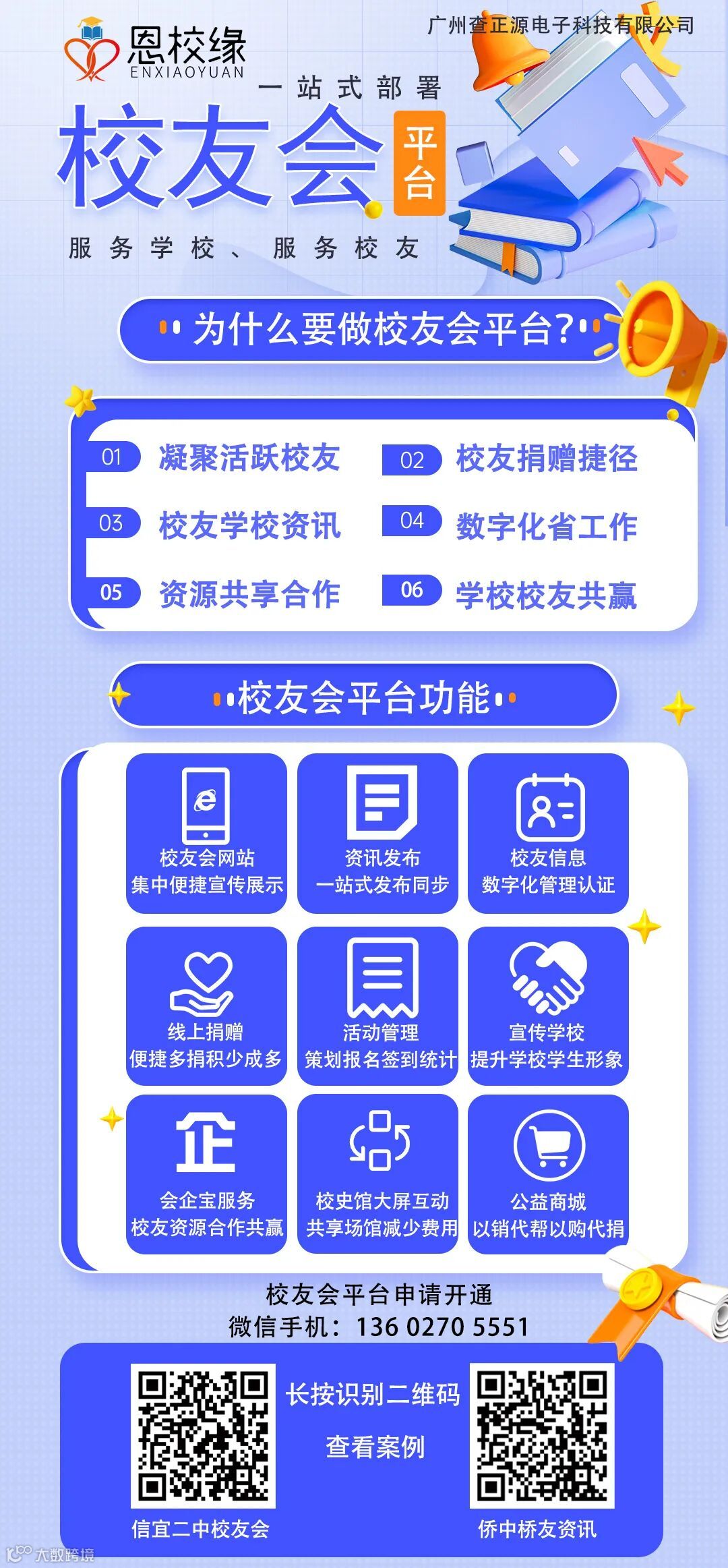 广州查正源电子科技有限公司专注于校友会平台的开发与运营,致力于为校友会提供智能化、高效化的管理工具。我们深知校友会工作的复杂性与重要性,因此特别推出了一款功能强大的校友会平台,助力校友会更好地凝聚校友力量,推动母校发展。