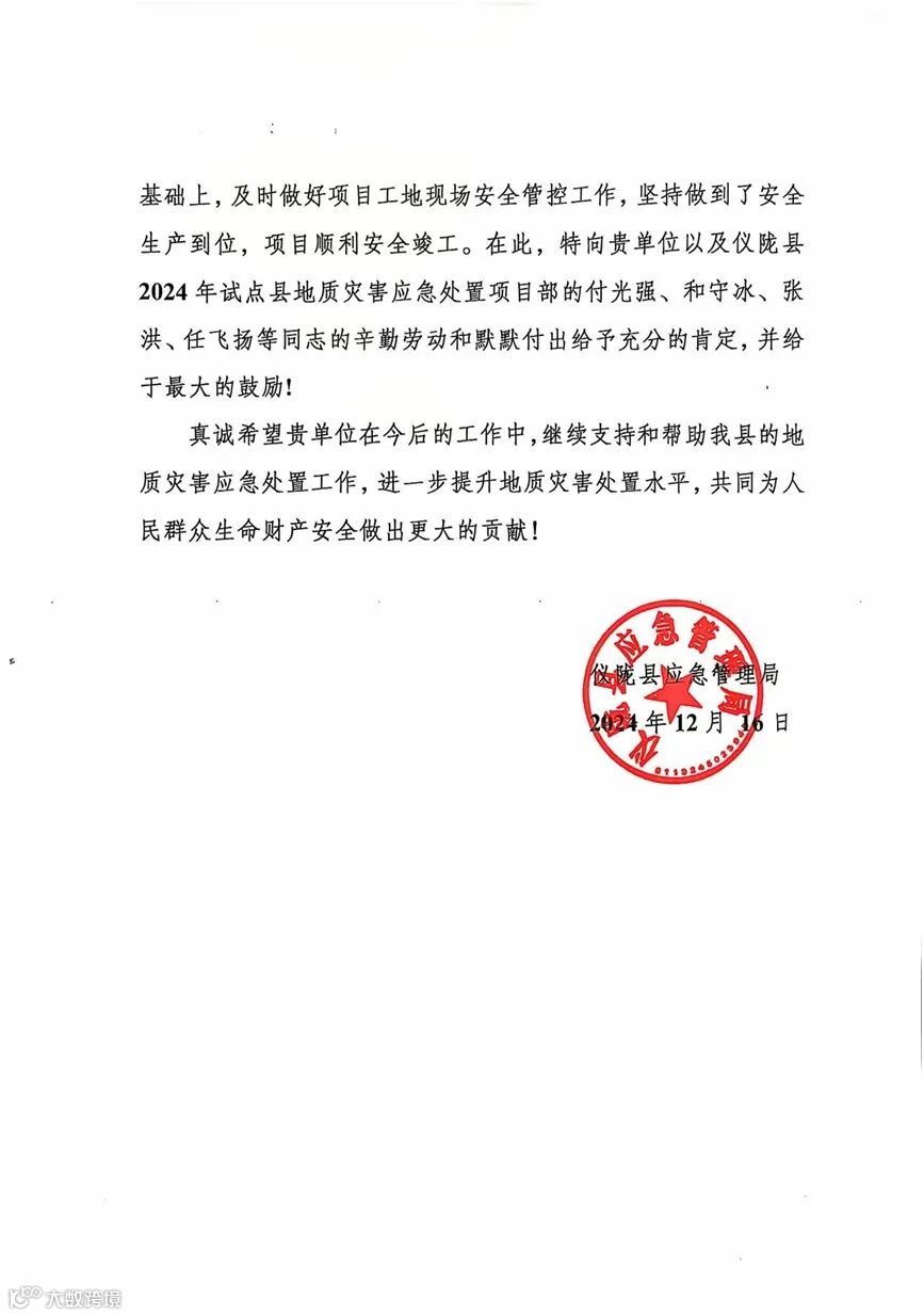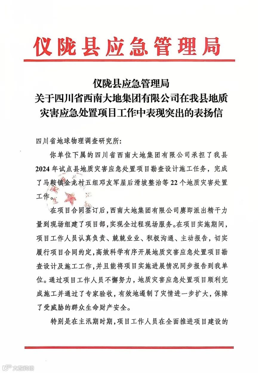 近日,四川省西南大地集团有限公司承担的仪陇县2024年试点县地质灾害应急处置项目圆满完成,赢得仪陇县应急管理局的高度认可与赞扬。