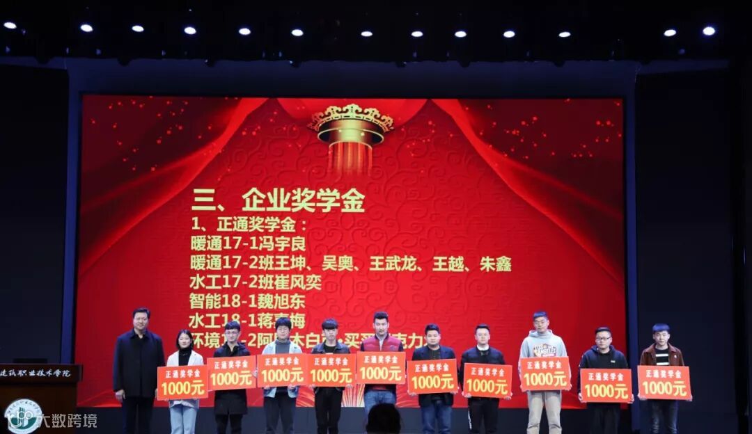 11月20日下午,江苏建筑职业技术学院建筑智能学院2019年优秀学生表彰大会在江苏建筑学院隆重举行,正通公司董事长张义先生为获得正通企业奖学金的优秀学子颁发了荣誉奖证书和奖学金。