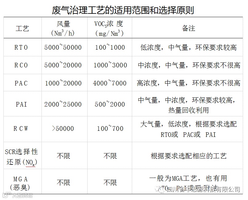 综合以上废气的治理方法,针对不同风量和不同 VOCs浓度的有机废气,选择合适工艺的具体原则见下表。