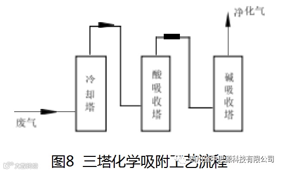 (3) 当废气中只含无机物,且酸性、碱性兼有时, 可采用三塔化学吸附法(见图8)。