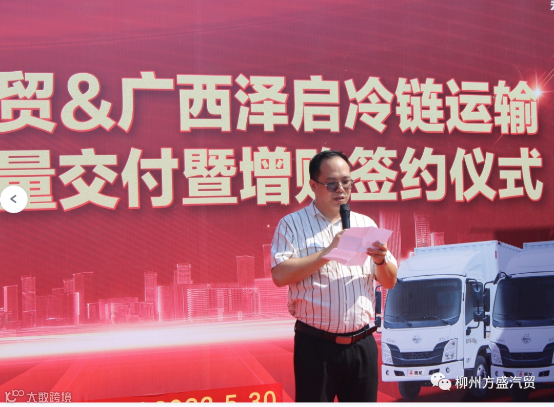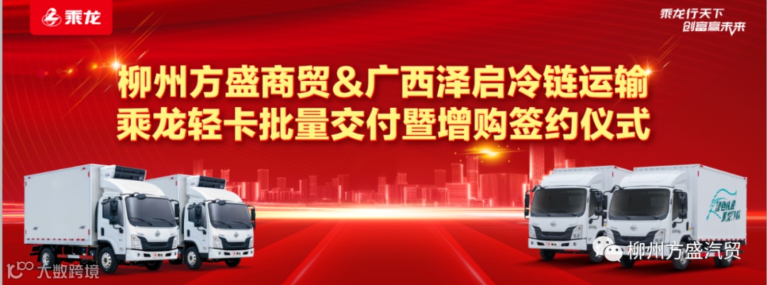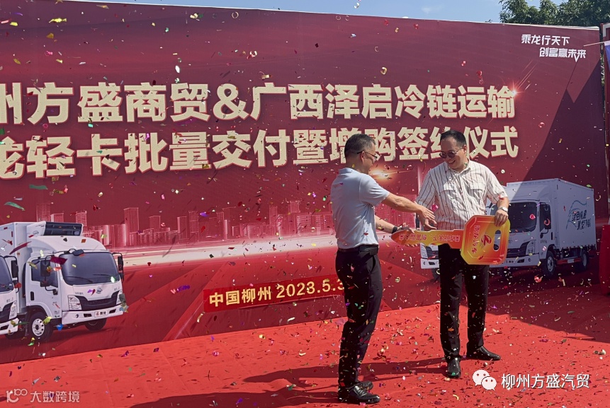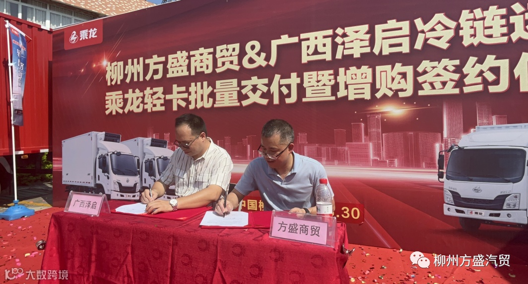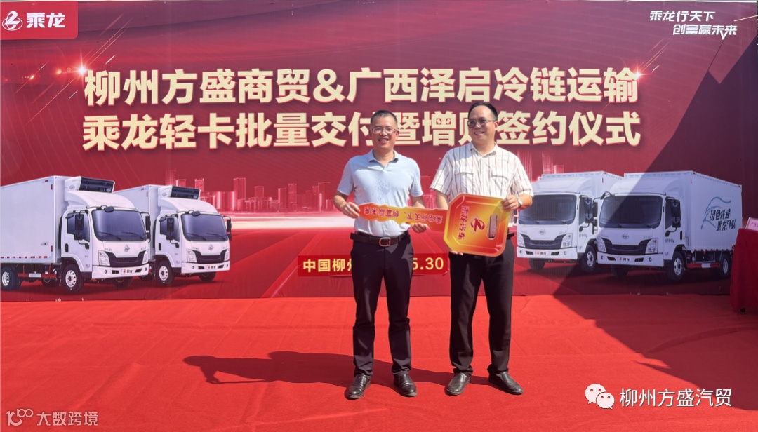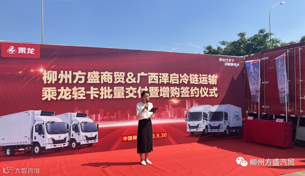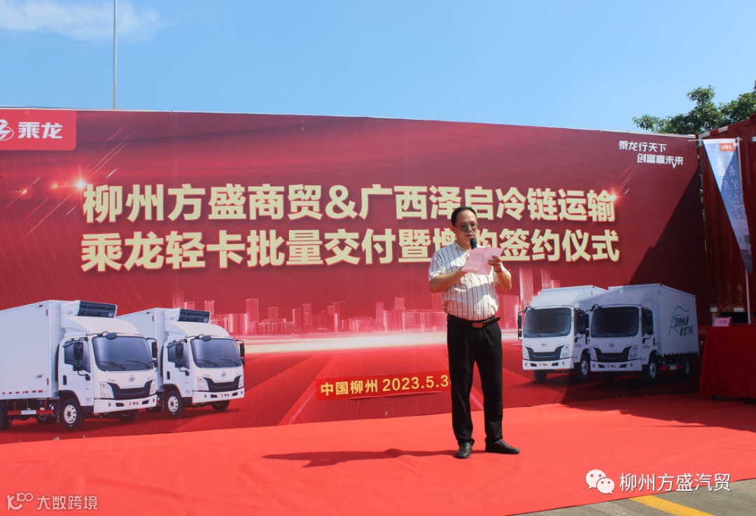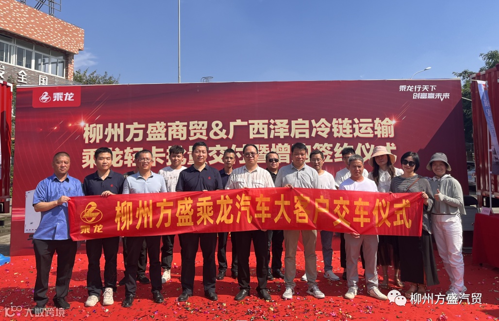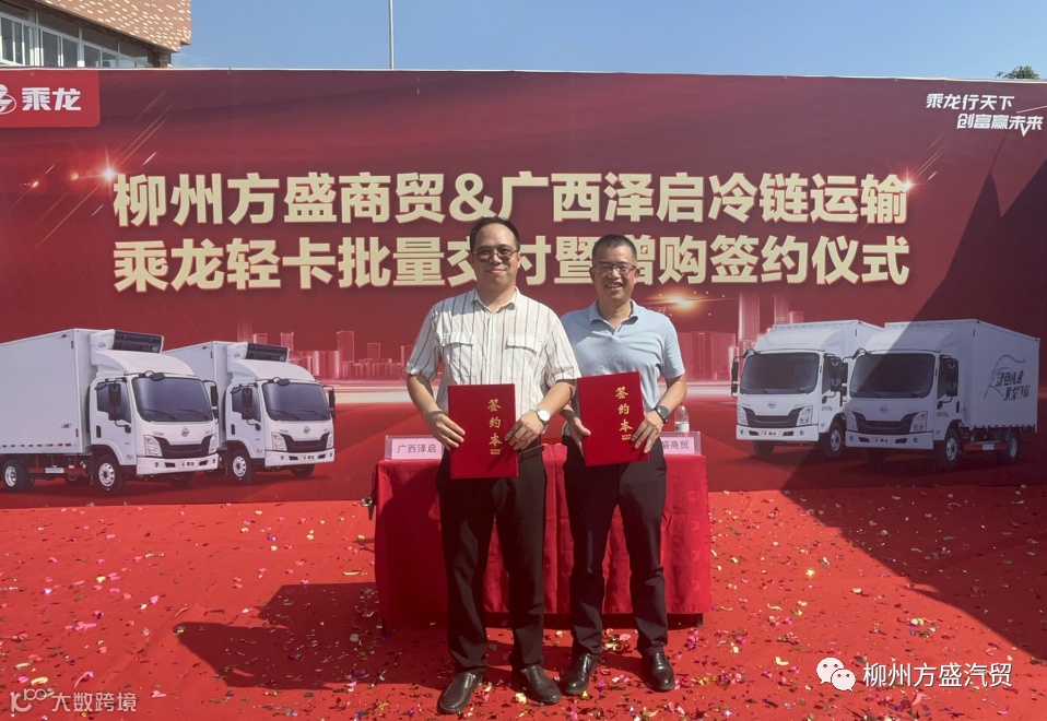 2023年5月30日,柳州市方盛汽车商贸有限公司与广西泽启冷链运输有限公司乘龙轻卡交付暨增购签约仪式,在柳州华乐物流园隆重举行。
