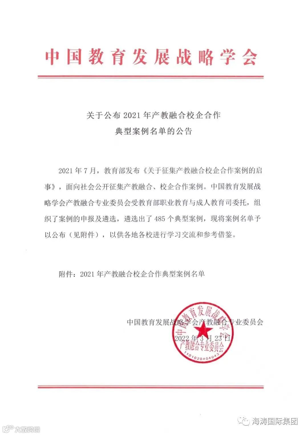 热烈祝贺“海涛服务学院”荣获2021年国家产教融合,校企合作典型案例。
