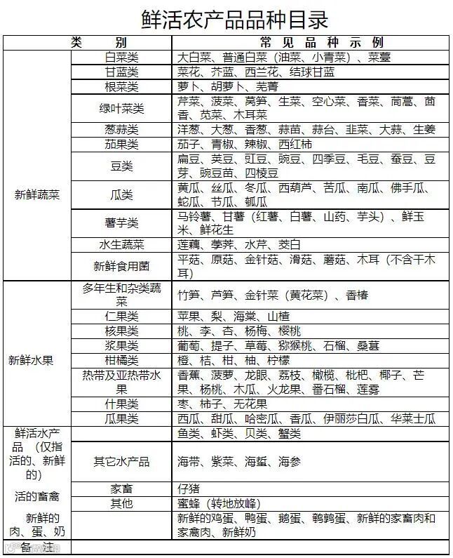 鲜活农产品必须在属于免费的品种范围里面,《通知》明确列明了可享受免费政策的《鲜活农产品品种目录》,包括新鲜蔬菜、新鲜水果、鲜活水产品和新鲜的肉蛋奶等大类中的128个具体品种或类别,这些品种基本满足了群众的日常生活需要。