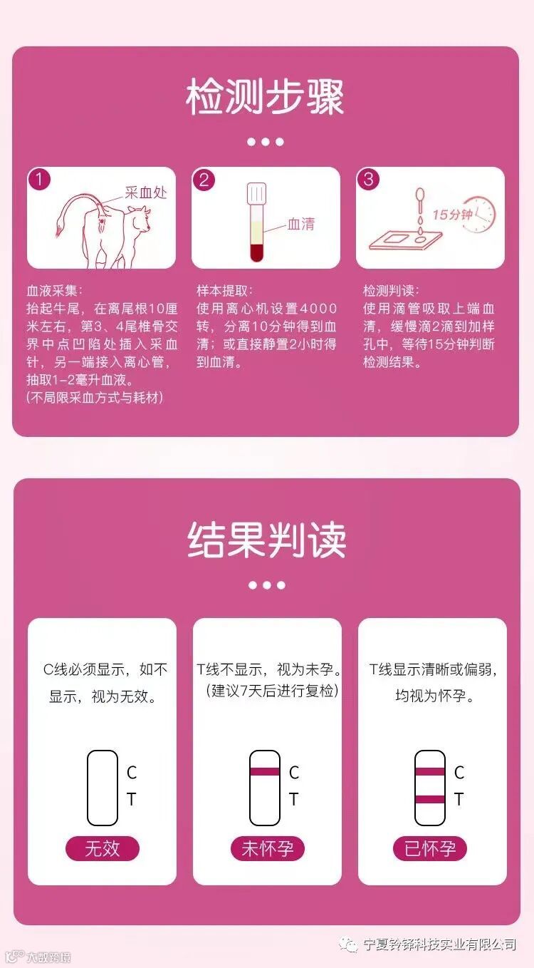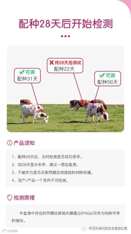 根据PAGs的产生来源,通过检测母体血液中的PAGs判断妊娠这一方式有了很高的准确性保证。母牛若没配妊成功,则体内不产生PAGs;母牛若怀孕后,其体内PAGs浓度开始上升,考虑到不同个体中该物质水平的差异,一般在妊娠25~30天后才将PAGs作为可靠的妊娠指标。爱牧多早孕卡,28天快检技术可在配种后第28天起,就可以准确鉴别诊断怀孕牛和空怀牛。
