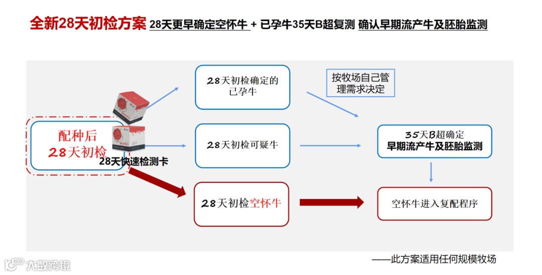 某牧场奶牛存栏量5000余头,通过牧场繁育师用牧场自有B超进行检胎,在配种后35天开始以周计划进行检胎。牧场于5月开始进行了28天牛早孕快检卡的试用比对工作。
