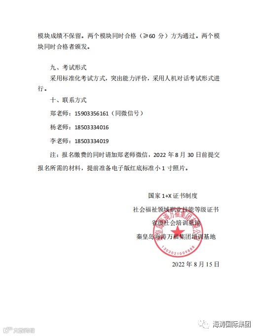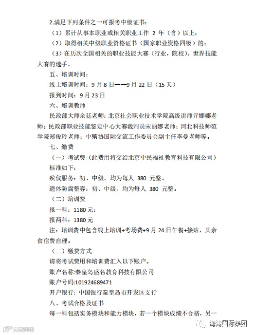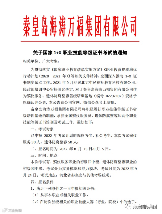 海涛国际集团1+X证书第四期培训考试班开始招生,培训考试科目为遗体防腐整容和殡仪服务员,具体内容如下: