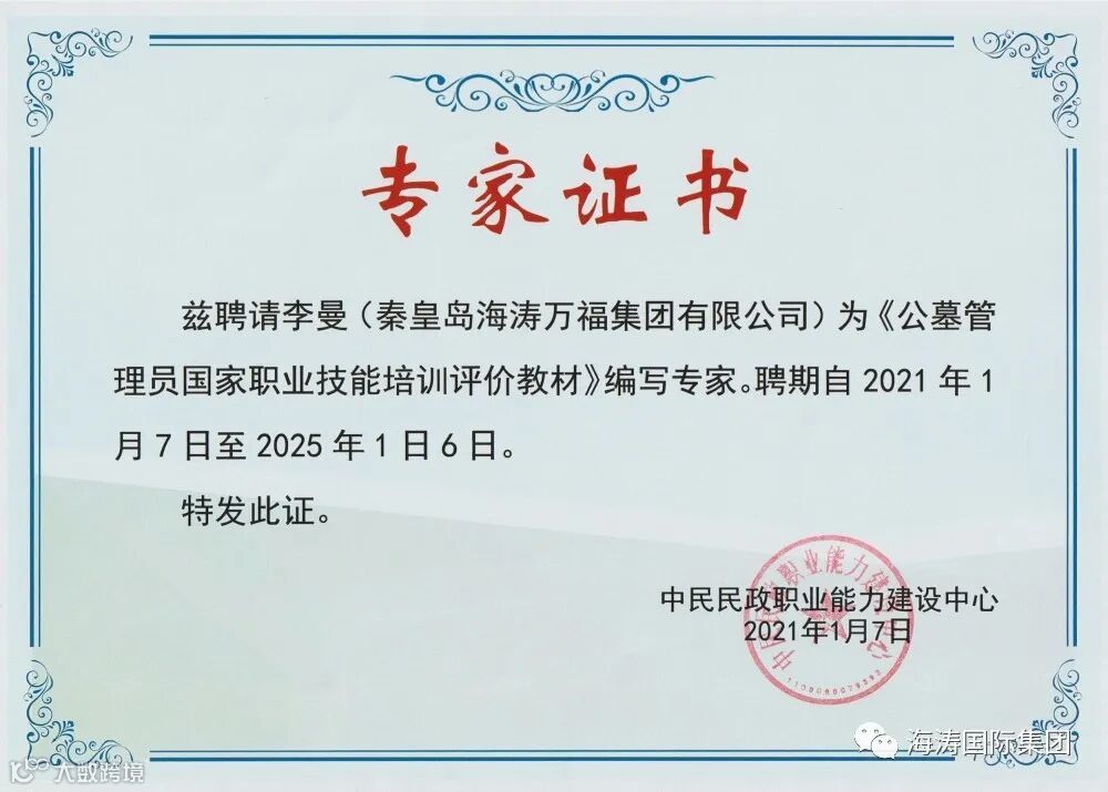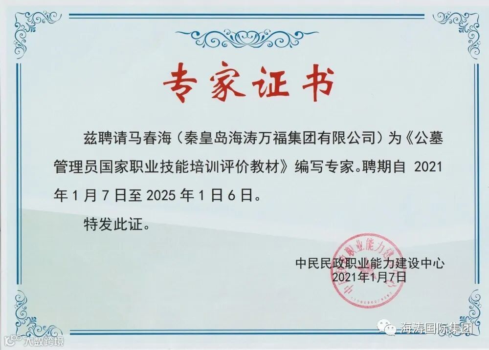 秦皇岛海涛万福集团有限公司(现已更名为:海涛集团(贵州)环保科技有限公司)再创佳绩,恭喜我公司党支部书记马春海同志、副总裁李曼同志、海涛集团部门经理张广军同志被聘为中民民政职业能力建设中心《公墓管理员国家职业技能培训评价教材》编写专家。