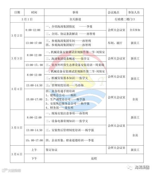 参加本次培训会议的有,海涛集团与波涛公司部分行政管理人员,秦皇岛海涛集团下设的,安装售后服务总公司即将新组建的,秦皇岛设备安装售后服务安装一队,二队。河南安装队,四川安装队,安徽安装队,湖南安装队,陕西安装队,江西安装队。波涛公司设备安装售后服务一队,二队。