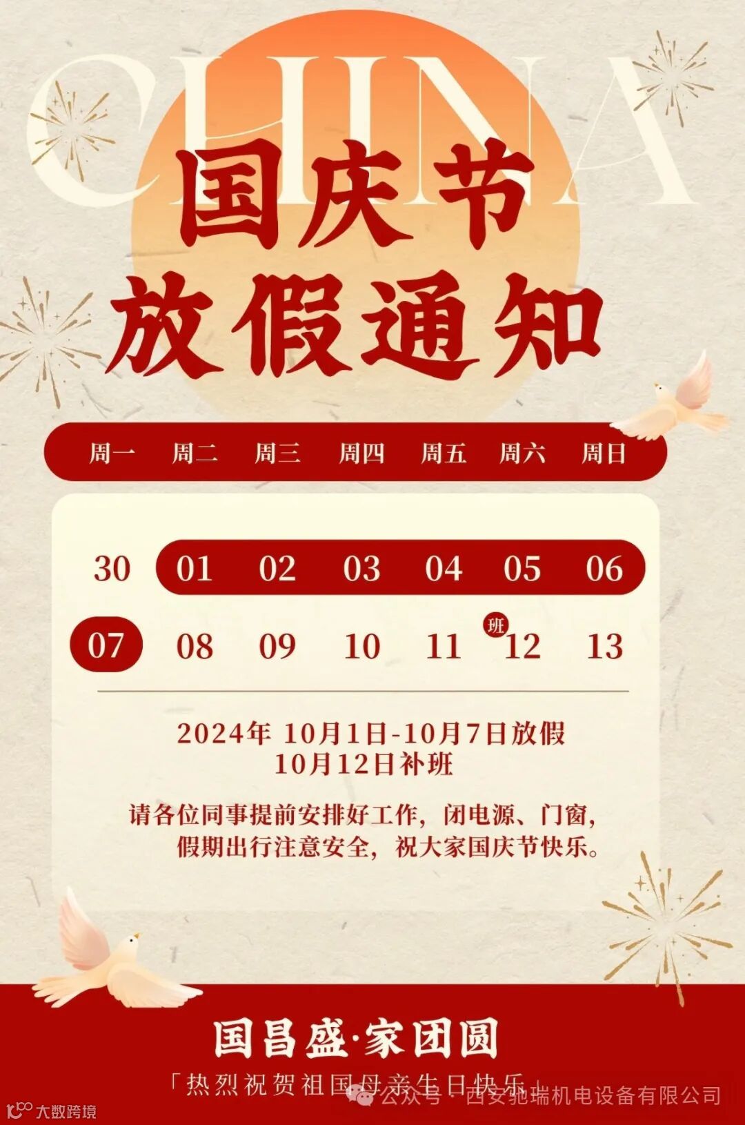 据《国务院办公厅关于2024年部分节假日安排的通知》规定,本公司放假时间安排为:10月1日(周二)至10月7日(周一),共7天。