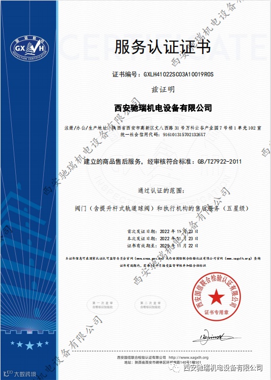 继2022年4月我公司通过ISO9001 质量管理体系认证、ISO14001 环境管理体系认证、ISO45001 职业健康安全体系认证、HSE 健康、安全与环境体系认证后,近日,西安国信联合检验认证有限公司专家组对西安驰瑞机电设备有限公司的商品售后服务情况进行认证,一致确认公司服务售后满足认证标准和法律法规的要求,达到GB/T27922-2011标准并取得服务认证证书。