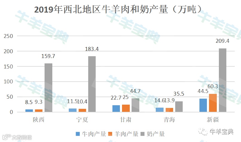 从牛羊肉和产奶量数据来看,西北地区2019年牛肉产量101.8万吨,占全国产能15.3%;羊肉产量118.9万吨,占全国产能24.4%;奶产量632.7万吨,占全国产量19.2%。