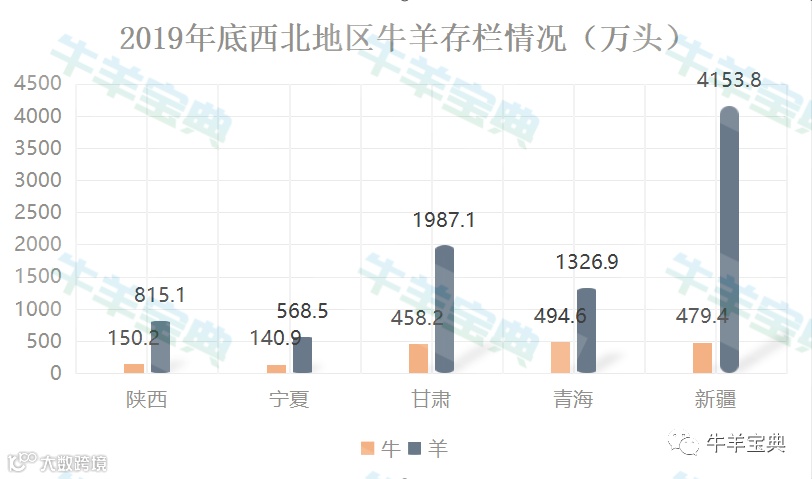 根据《2020中国统计年鉴》数据,2019年底西北地区陕西、宁夏、甘肃、青海和新疆合计牛存栏1723.3万头,占全国存栏量18.9%,羊(包括山羊和绵羊)存栏8851.4万头,占全国存栏量的29.4%。