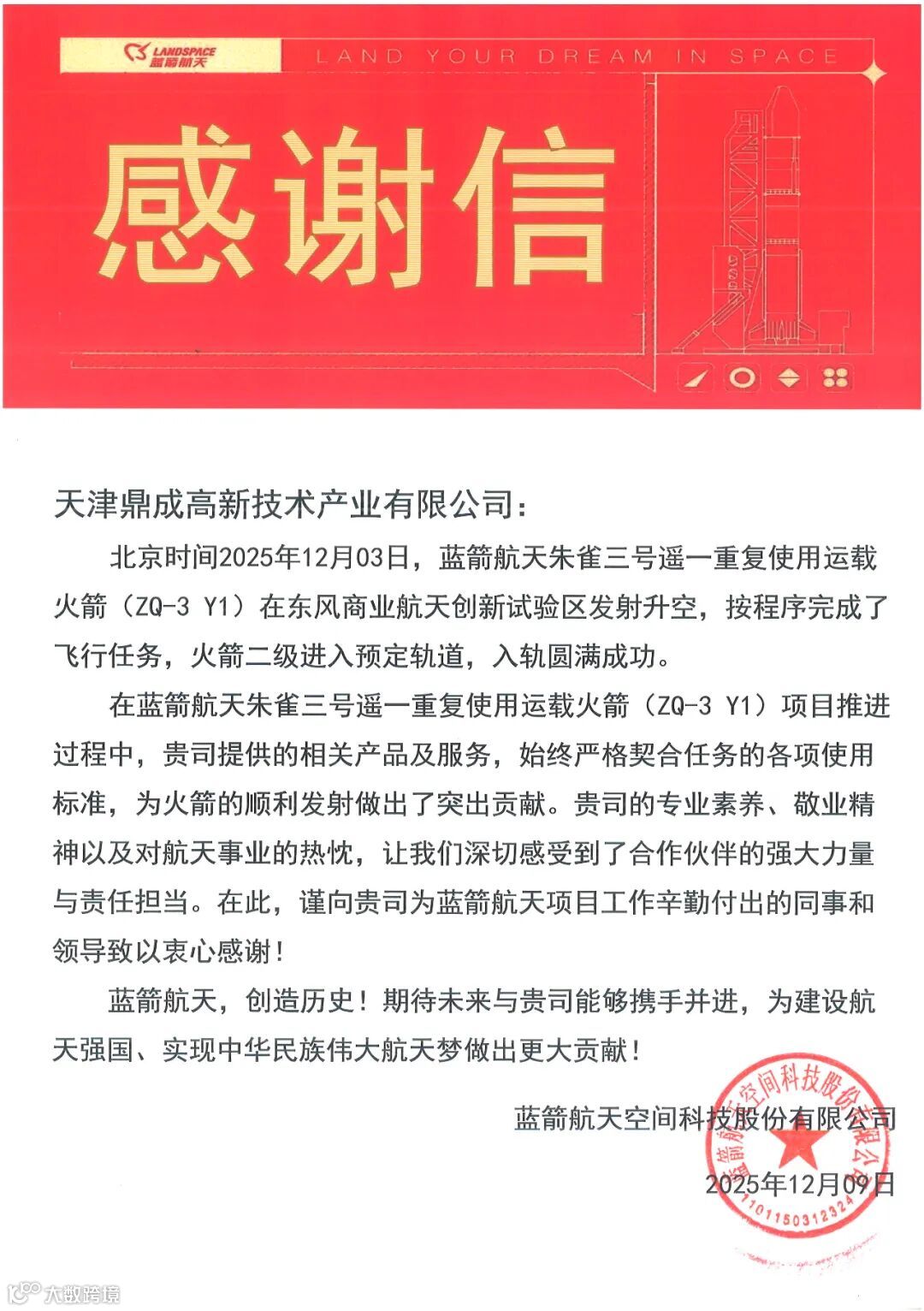 近日,蓝箭航天空间科技股份有限公司向我公司下属天津鼎成高新技术产业有限公司(简称“鼎成公司”)发来感谢信,对鼎成公司在朱雀三号遥一重复使用运载火箭(ZQ-3 Y1)项目推进过程中,提供的牵制释放综合试验系统及相关服务表示高度认可与诚挚感谢。鼎成公司提供的相关产品及服务,始终严格契合任务的各项使用标准,为火箭的顺利发射做出了突出贡献。
