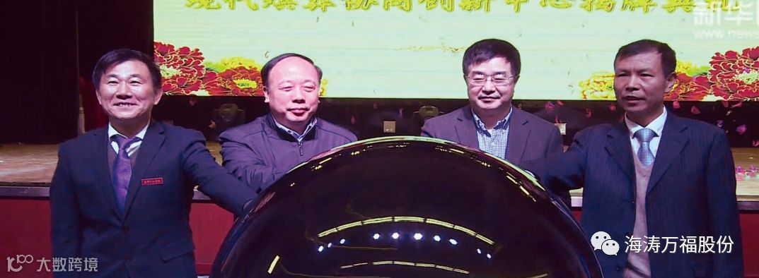 北京社会管理职业学院现代殡葬协同创新中心启动仪式,民政部社会事务司王金华司长(右二)、邹文开院长(左二)、海涛股份公司孙智勇董事长(右一)、生命文化学院孙树仁院长(左一)共同启动发光球,为现代殡葬协同创新中心揭牌。