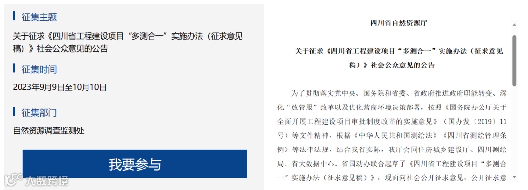 为了贯彻落实党中央、国务院和省委、省政府推进政府职能转变、深化“放管服”改革以及优化营商环境决策部署,按照《国务院办公厅关于全面开展工程建设项目审批制度改革的实施意见》(国办发〔2019〕11号)等文件精神,根据《中华人民共和国测绘法》《四川省测绘管理条例》等法律法规,结合我省实际,我厅会同住房城乡建设厅、四川测绘局、省大数据中心、省国动办联合起草了《四川省工程建设项目“多测合一”实施办法(征求意见稿)》,现面向社会公开征求意见,公开征求意见时间为2023年9月9日—2023年10月10日。