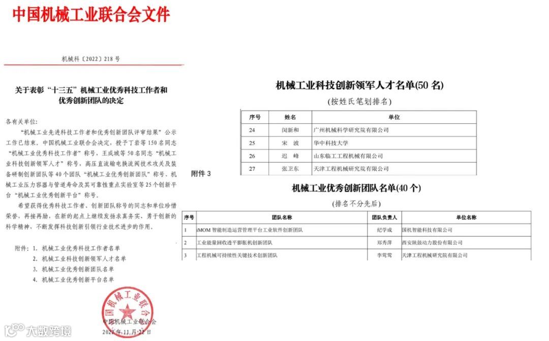 机械工业优秀创新团队和优秀科技工作者每五年评选一次,此次是对在“十三五”期间中国机械工业科技创新工作中所涌现的先进个人、创新团体和优秀成果予以表彰。全国共评审出机械工业科技创新领军人才50名,机械工业优秀创新团队40个。其中科技创新领军人才工程机械行业共获评2人,优秀创新团队共获评2个。