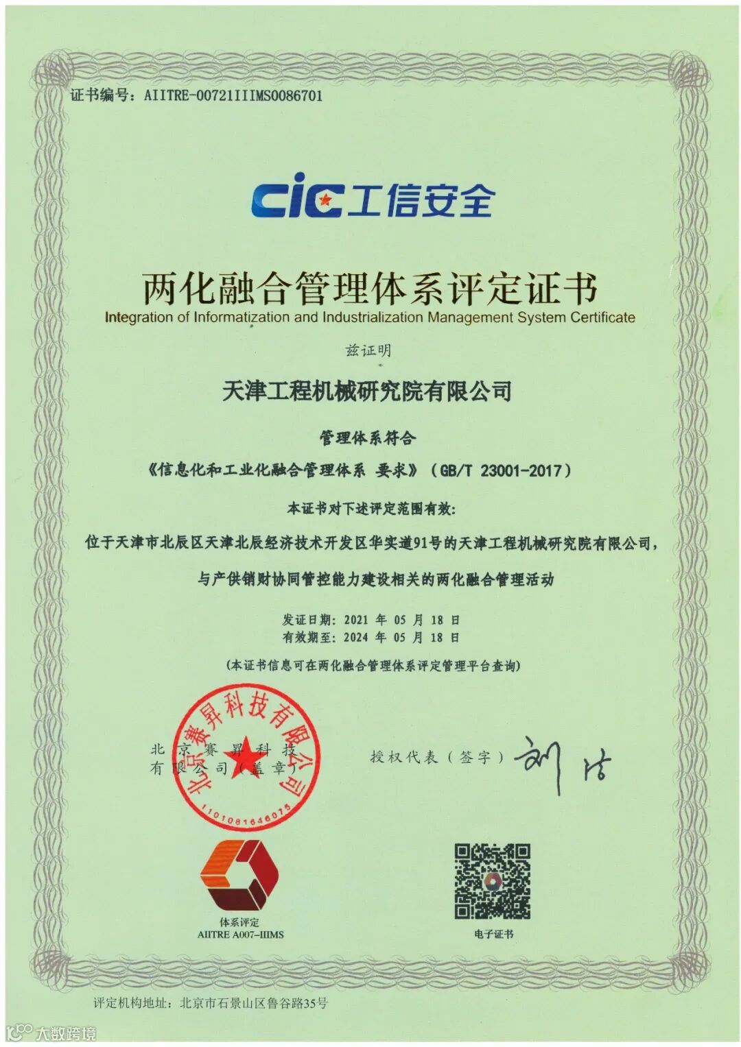 5月18日,在喜迎天工院建院60周年之际,天工院荣获由国家工信部签发的《两化融合管理体系评定证书》,标志着天工院在信息化建设方面又迈出了崭新的一步。