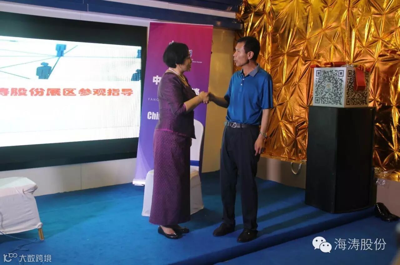 图为:孙董事长在上沙展会上与柬埔寨总理夫人交谈