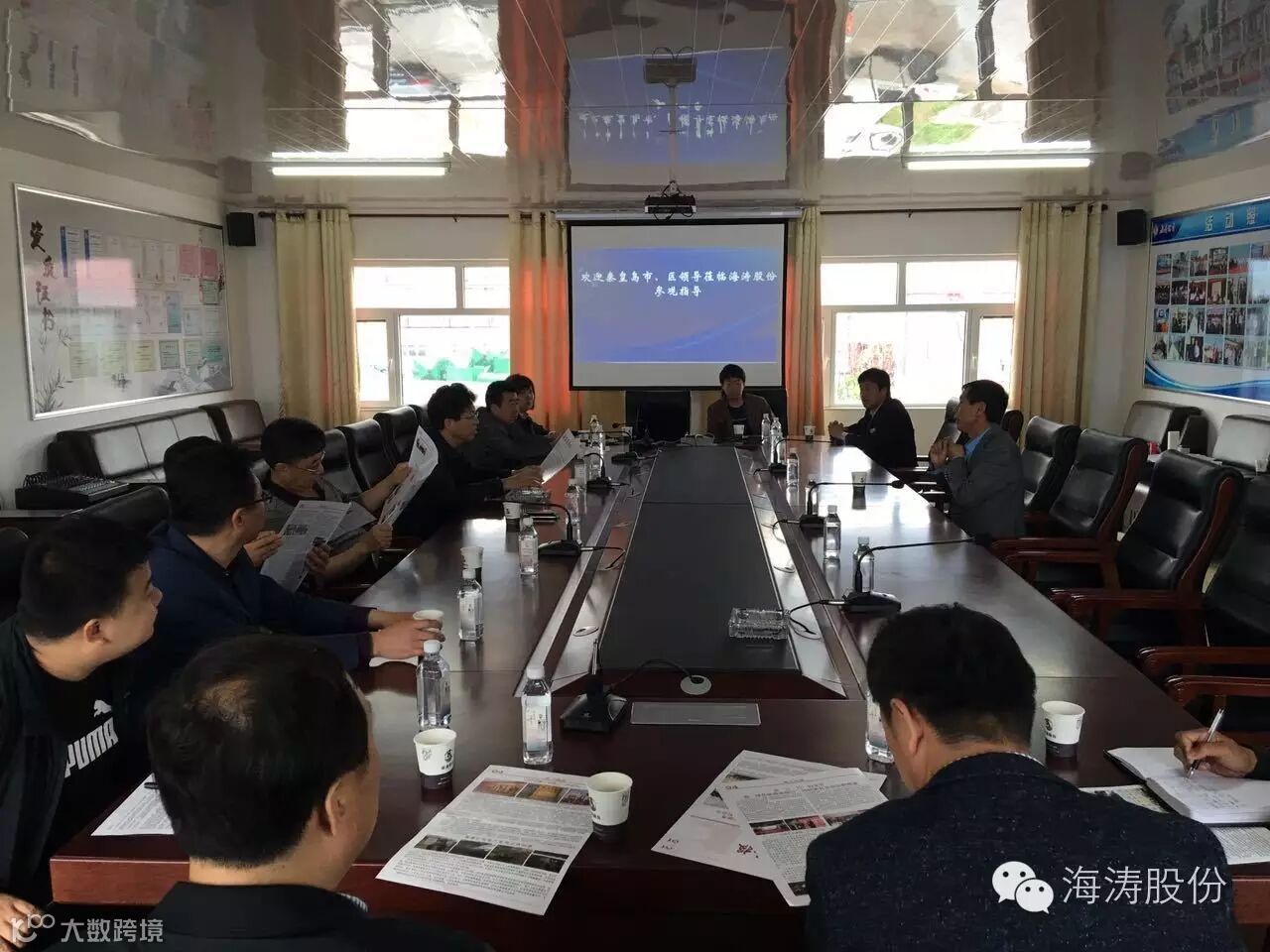 2016年5月12日,秦皇岛市委秘书长、秦皇岛市海港区刘区长及有关局、处、室领导共14人莅临海涛股份公司考察,在公司三楼会议室召开了座谈会.孙董事长向领导们介绍了公司新型环保设备及公司未来发展方向,并汇报了公司上市情况,得到了领导们的支持和肯定.