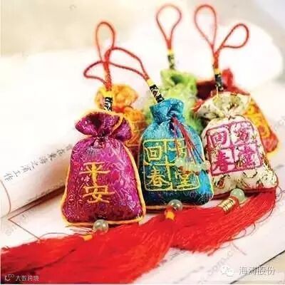 戴香包,香包又叫香袋、香囊、荷包等,有用五色丝线缠成的,有用碎布缝成的,内装香料(用中草药白芷、川芎、芩草、排草、山奈、甘松、高本行制成),佩在胸前,香气扑鼻。陈示靓的《岁时广记》引《岁时杂记》提及一种“端五以赤白彩造如囊,以彩线贯之,搐使如花形。”以及另一种“蚌粉铃”:“端五日以蚌粉纳帛中,缀之以绵,若数珠。令小儿带之以吸汗也”。这些随身携带的袋囊,内容物几经变化,从吸汗的蚌粉、驱邪的灵符、铜钱,辟虫的雄黄粉,发展成装有香料的香囊,制作也日趋精致,成为端午节特有的民间艺品。