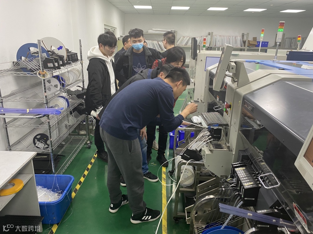 驰云科技董事长周黎(左一)向石马河街道养老服务中心丁院长(中间)介绍主板贴片