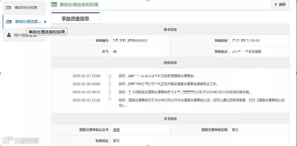 公安交管部门在处理事故时,将按规定告知事故当事人各方或者事故车辆所有人、事故车辆承保保险公司人员可以网上查询事故处理进度和结果。查询主体为事故车辆所有人、事故车辆承保保险公司人员的,还需提交书面申请进行审核。符合规定的,可以为其制作发放查询凭证,查询凭证包括事故编号、查询码和责任义务等信息,查询人应保管好查询凭证,防止信息泄露。事故当事人各方无需申请,交管部门直接为其制作发放查询凭证。