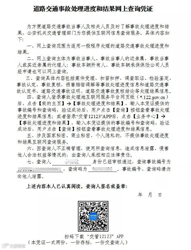 查询主体可以通过登录 “交管12123”APP或者互联网平台网页版(he.122.gov.cn),输入查询凭证提供的事故编号和查询码进行查询。