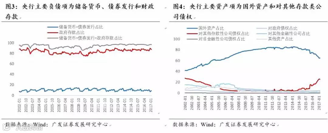 ①在所有负债项中,储备货币和债券发行为央行可主动调控的负债手段,两者加总占比相加接近90%,财政存款占比均值在10%左右,三者相加占比均值在97%左右。