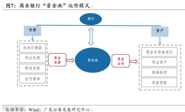 至此我们可以得到商业银行运作是从负债端融入资金,资产端融出资金,但每一笔负债端的资金并不对应资产端资金,商业银行相当于一个“蓄水池”。