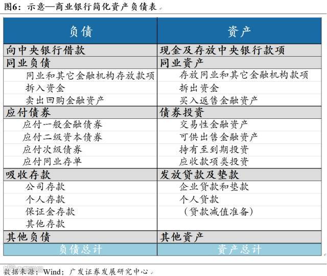 简化商业资产负债表,资产可以归为五类:现金及存放在中央银行款项、同业资产、债券投资、发放贷款和垫款、其他资产。负债也同业可以简要分为五项:向中央银行借款、同业负债、应付债券、吸收存款、其他负债。