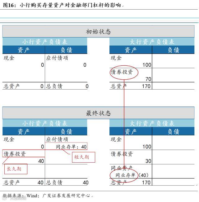 与情况1相同,大行将闲置资金融给小行,小行负债端也发生同样变化。但与情况1不同的是,小行将资金投向大行的存量资产(例如债券),此时资金再次回到大行表内部分。例如此轮金融杠杆迅速扩张背后的“小行发行同业存单-->购买存量债券”模式,虽然小行资产负债都有所扩大,但从整体金融部门来看,负债端依然是100现金没有变化,资产端70债券也未有变化。所以金融部门整体杠杆率未有影响。值得强调的是,这种结构性扩表模式对金融体系流动性带来深刻影响,主要是期限错配风险加剧,且蕴含流动性风险,本系列后续文章将对此进行详细分析。