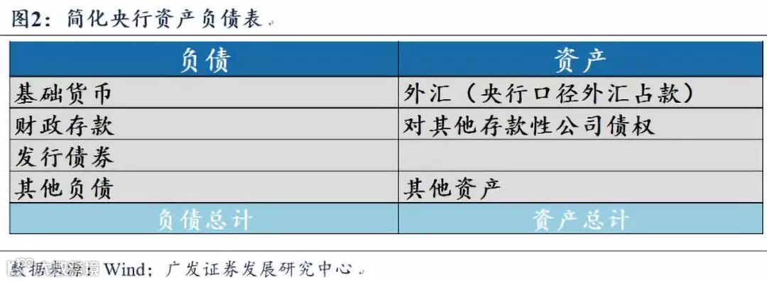 至此我们可以得到央行的简化资产负债表:资产项主要包括基础货币、政府存款、债券发行;资产项主要包括外汇资产、对其他存款性公司存款。