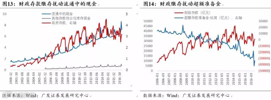 ②财政存款为货币在流通领域中以财政存款缴存方式退出流通领域。财政存款缴存进入国库,这一部分存款不能为其他金融机构所用,自然也不能派生其他存款或贷款,相当于从货币流通领域退出来。这也是为何季度财政存款缴存会引发货币市场流动性收紧,对流通中的货币总量以及银行超额存款准备金量均产生冲击。