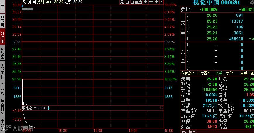 视觉中国今日开盘被巨量卖单封死跌停,报25.2元,最新总市值为176亿。上一交易日,视觉中国收盘价为28元。今日该公司将有3.88亿股解禁,占公司总股本的55.39%,市值逾百亿元。