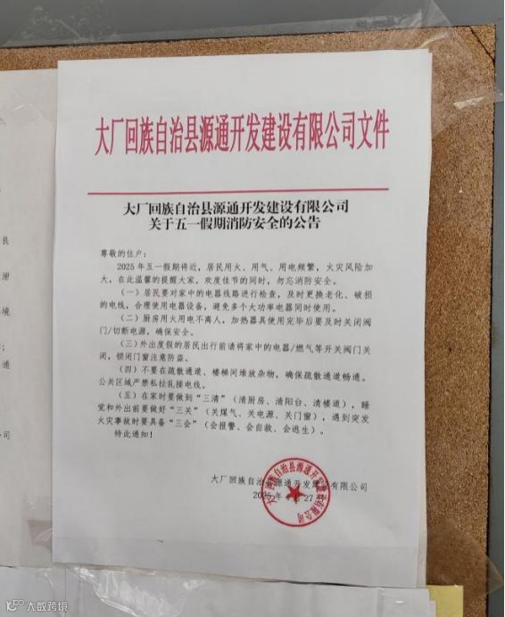 五一假期将至,为确保各保障房住户度过一个平安、愉快的假期,大厂回族自治县源通开发建设有限公司积极响应消防安全管理要求,于假期前,在各项目公告栏张贴《关于五一假期消防安全的公告》,全面加强节日期间消防安全宣传与防范工作,来提升住户的消防安全意识。