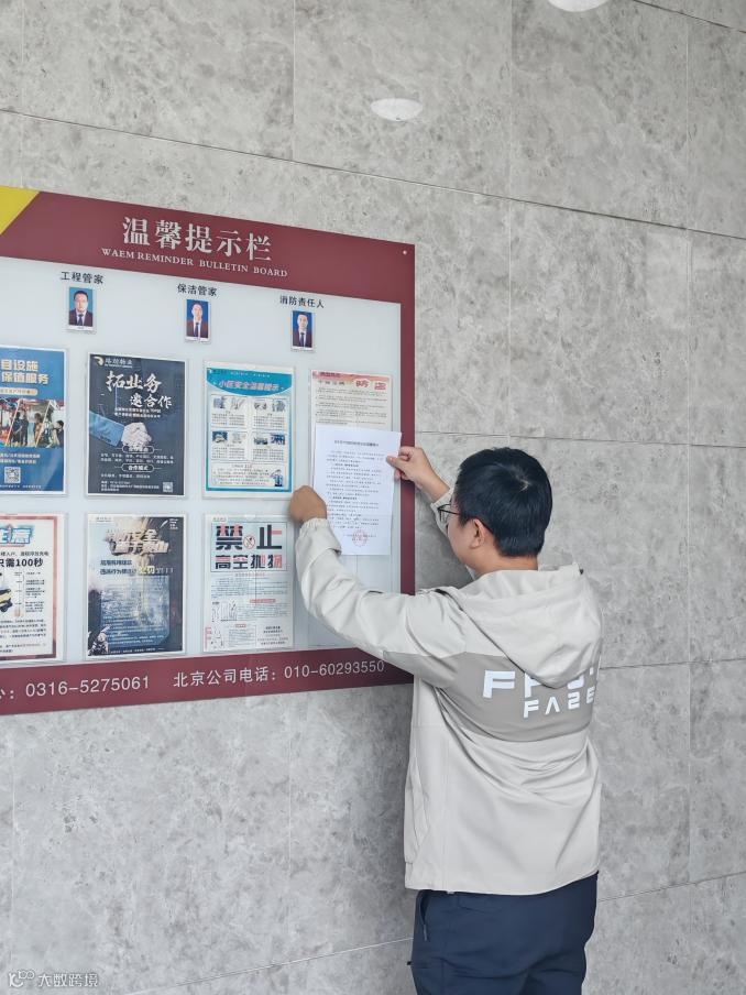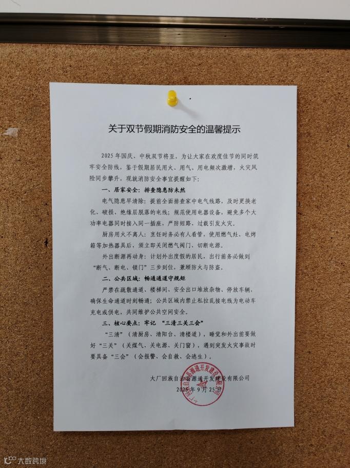 巡查工作聚焦重点区域与关键环节,对走廊门窗密封、疏散通道畅通及消防设施配备等情况进行全面细致排查,确保不留死角、不漏隐患。针对巡查发现的问题,公司坚持问题导向,建立专项台账,明确整改责任、整改时限与整改标准。同时,主动对接地产公司、物业公司协同推进维修整改工作,安排专人全程跟踪督办,严格落实闭环管理要求,从源头上防范化解安全风险,切实保障各类设施设备安全稳定运行。巡查结束后,为进一步强化安全警示,源通公司第一时间在各项目公告栏张贴《关于双节假期消防安全的温馨提示》。提示内容重点明确用火、用电、用气等日常安全注意事项,详细说明应急处置要点,确保安全提醒精准传递。