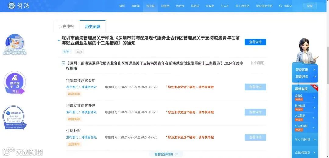“现在AI智能申报,提交马上看到预审结果,政策申报结束第三天,我就在前海管理局官网看到了补贴金额公示,前海速度让我惊喜!”深圳市嘉诚绿发科创控股有限公司香港青年杨利感慨。AI赋能补贴审批,大幅提高了审批效率和透明度。
