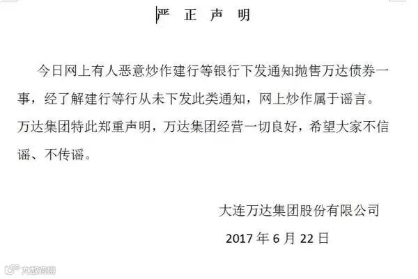 中午,万达集团发布声明回应称,网上炒作属于谣言,万达集团经营一切良好。