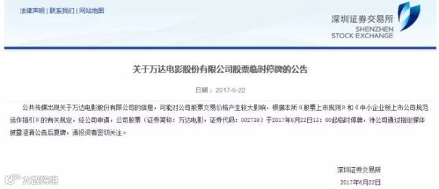 深圳证券交易所昨日发布关于万达电影股份有限公司股票临时停牌的公告。公告指出,经公司申请,公司股票(证券简称:万达电影,证券代码:002739)于2017年6月22日13:00起临时停牌。