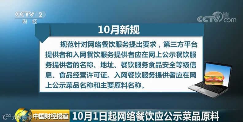 国家市场监管总局7月23日发布新修订的《餐饮服务食品安全操作规范》,自今年10月1日起施行。规范针对网络餐饮服务提出要求,第三方平台提供者和入网餐饮服务提供者应在网上公示餐饮服务提供者的名称、地址、餐饮服务食品安全等级信息、食品经营许可证。入网餐饮服务提供者应在网上公示菜品名称和主要原料名称。