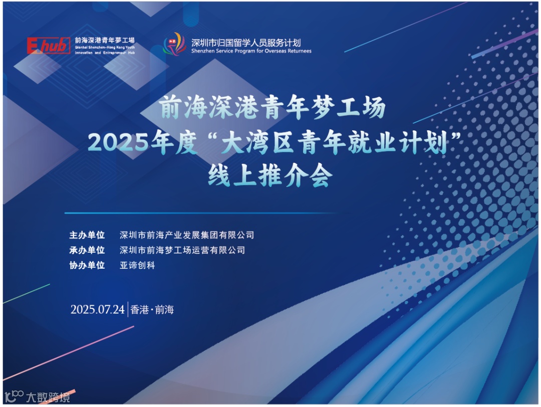 为深化深港青年人才交流合作,精准服务香港青年融入大湾区发展,2025年7月24日下午,由深圳市前海产发集团有限公司主办,深圳市前海梦工场运营有限公司承办,深圳亚谛科技有限公司协办的“前海深港青年梦工场2025年度全面对接大湾区青年就业计划系列活动线上推介会”在前海深港青年梦工场北区直播间成功举行。本次活动通过线上直播形式,聚焦香港特区政府“大湾区青年就业计划”,为香港青年解读政策、推介前海机遇、展示优质岗位,吸引了众多港青线上参与,反响热烈。